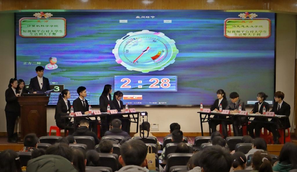 代表队作为正反双方,围绕“短视频平台对大学生生活利大于弊还是弊大于利”这一辩题展开冠亚之争。