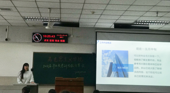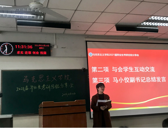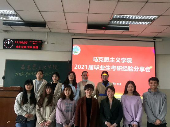 在东校区12教102室举行了2021届毕业生首场考研经验分享会,部分2021届考研学生代表、2018 级全体本科生、2020级第二学士学位学生参加会议,会议由辅导员张云雾主持。