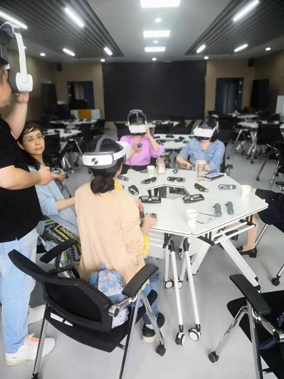 的生命长江虚拟仿真教学体验中心。徐骆给老师们介绍了3D大屏游览红色景点和VR一体式头盔开展思政主题应用的交互体验。随后,老师们体验了《VR长征史诗》中的“爬雪山”“过草地”等场景。并就马原课程与VR相结合的途径和前景进行了讨论。