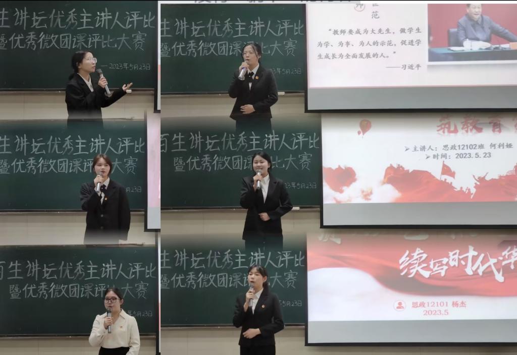 于12教104室举办2023年“百生讲坛”优秀主讲人评比暨优秀微团课评比大赛。学院党委副书记马小佼、学工办主任张云雾、青年教师陈质晶、辅导员李敏及全体大一学生参会。