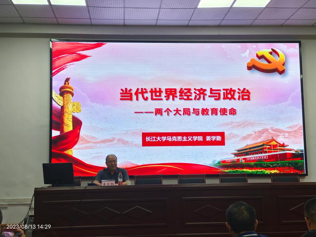 姜学勤院长。姜院长以当代世界经济与政治为题,从百年未有十大变局、中华民族伟大复兴的战略全局、教育使命等几个方面,给我们做了一场精彩的报告,整个报告放眼世界统观全局,深入浅出,结合了教育实践,为我们解析中国与世界经济的关系,包括面临当下严峻的国际形势,中国实施的正确的发展战略和方针政策。整个报告有理论深度,有思想深度,有针对性、实效性,对我们全面而正确的践行教育使命,具有极强的指导意义。