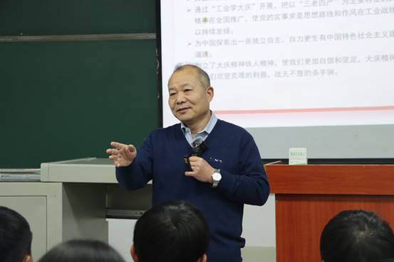 “每一个继往开来的时代,都在呼唤英雄人物的诞生,也为他们的诞生创造了舞台。”郭教授分别从铁人精神的历史定位、铁人王进喜的英雄事迹以及铁人精神的内涵三个方面讲述了铁人的荣光与骄傲。