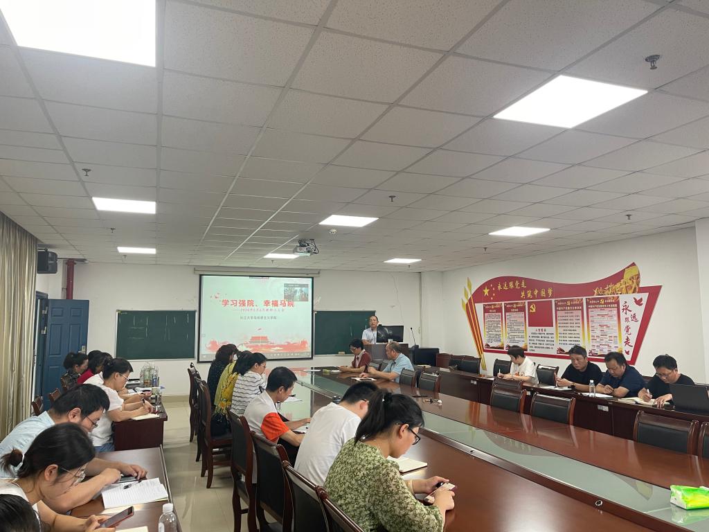 在文科楼1104室召开本月教职工大会,全院教师以线上线下相结合的方式参会。会议由院长姜学勤主持。