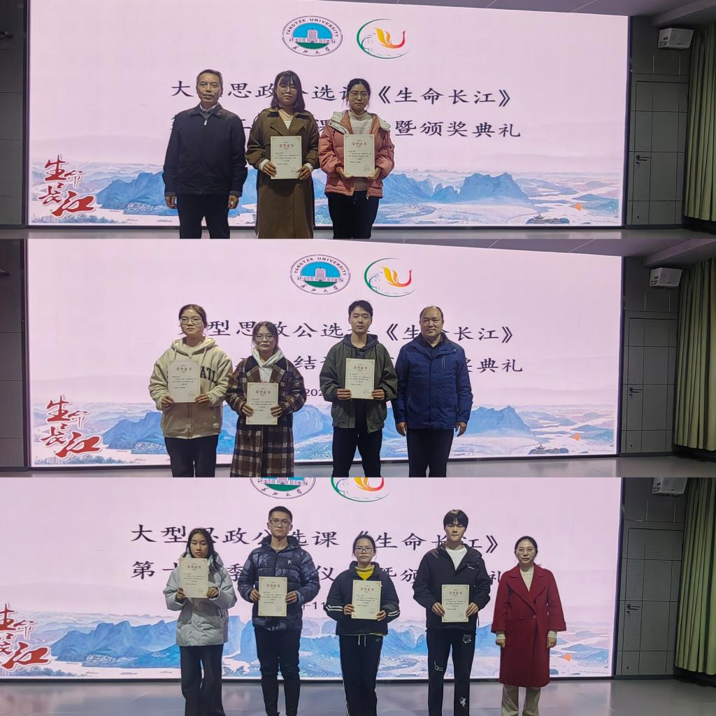 寻长江之踪迹,悟长江之精神。这一季老师与学生双向奔赴、课上与课下互动精彩,在学、思、践、悟中涌现了一批活跃课堂、启发教学的优秀学员。助教团队王悦悦宣布了本季优秀学员获奖名单,并举行了《生命长江》第十二季结课仪式暨颁奖典礼。一等奖获奖者秦雯婧、胡雯琴,由朱业宏老师为他们颁奖。二等奖获奖者邓凎、蓝佳羽、骆静雯,由姜学勤老师为他们颁奖。三等奖获得者程奕烁、付格、严国艺、黎悦,由汤波兰老师为他们颁奖。