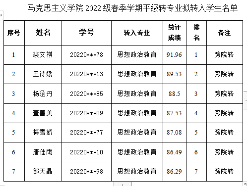 2022级本科生春季学期转专业拟接收名单予以公示。