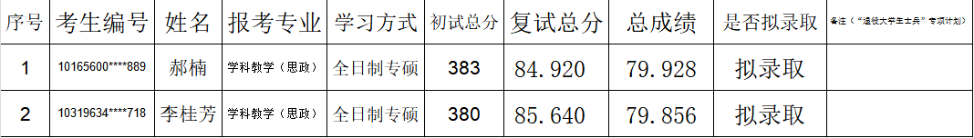 新增全日制专硕招生计划2个,现从递补拟录取考生中依次拟录取,现将拟录取考生的复试成绩及结果予以公示,复试成绩及拟录取结果见附件。