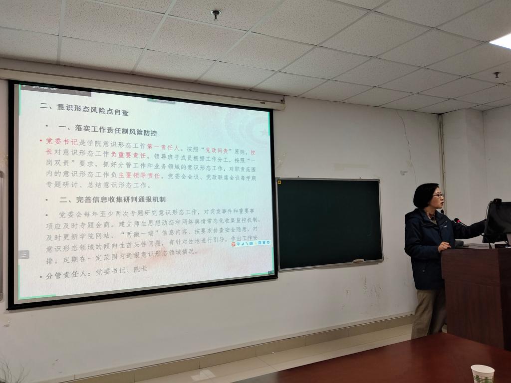 随后,学院党委副书记马小佼、副院长涂江波,二级机构负责人尹业香、徐骆、张莉、董继祥等老师也围绕学生工作、科研工作、教育教学工作领域的意识形态风险点进行了研讨发言。