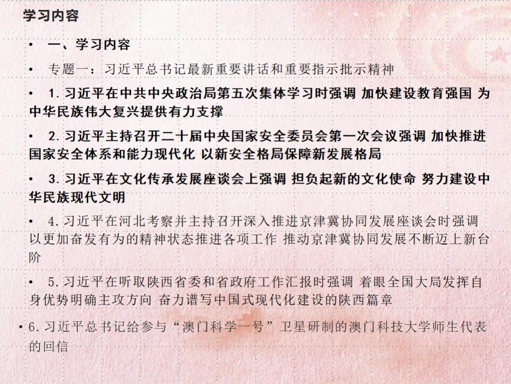 会上,与会人员共同学习了“习近平在中共中央政治局第五次集体学习时强调 加快建设教育强国 为中华民族伟大复兴提供有力支撑”、“习近平主持召开二十届中央国家安全委员会第一次会议强调 加快推进国家安全体系和能力现代化 以新安全格局保障新发展格局”、 “习近平在文化传承发展座谈会上强调 担负起新的文化使命 努力建设中华民族现代文明” “习近平总书记关于档案工作的重要指示批示摘编”、《关于在主题教育中认真学习借鉴“浦江经验”的通知》、《关于在主题教育中学习运用浙江“千万工程”经验案例的通知》、《关于认真学习贯彻习近平总书记重要讲话精神深刻领悟以学增智重要要求 推动主题教育走深走实的通知》以及“王蒙徽书记在荆州调研时的重要讲话精神” 等内容。