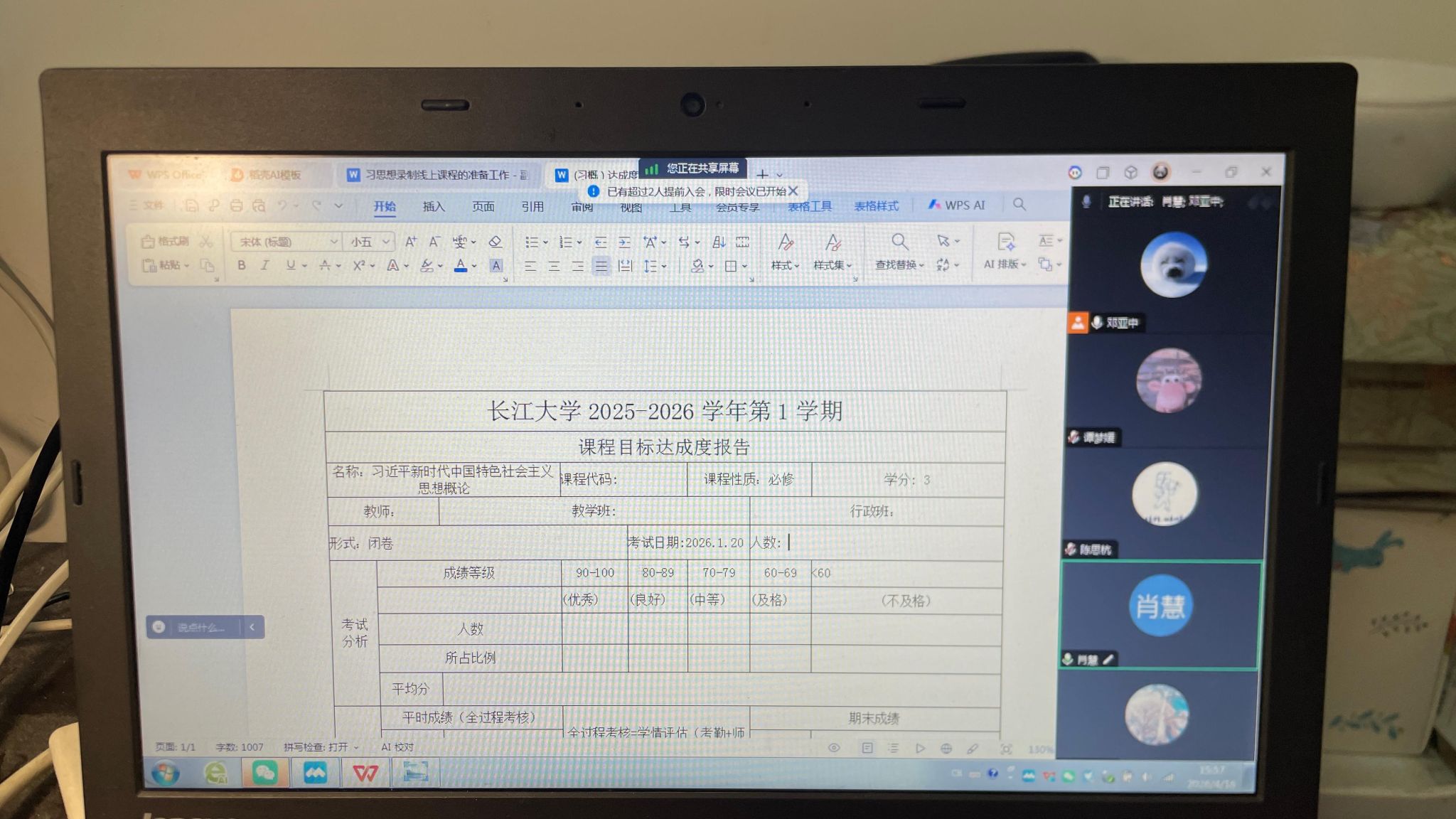 《习概》教研室为切实强化思政课堂育人实效,稳步做好学期教学常规管理工作,持续优化思政课程教学模式与育人体系,4月16日,《习概》教研室组织召开线上教学教研专题工作会议。教研室全体在岗教师参会,围绕教学常规自查整改、课堂教学质量优化、集体备课研讨交流、教研项目推进落实等重点内容,统筹安排部署、深入交流探讨,凝聚教研合力,助力课程教学提质增效。