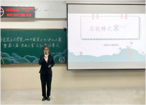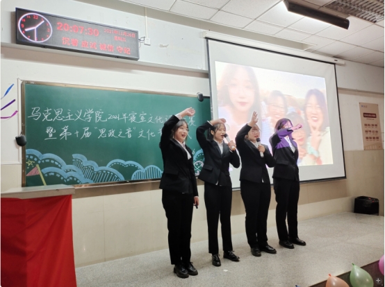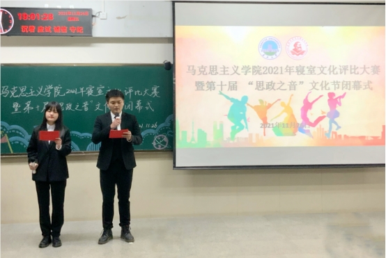 于12教102室举行2021年“心宿暖阳 乐寝无忧”寝室文化评比大赛暨第十届“思政之音”文化节闭幕式。学院党委书记刘小燕,院党委副书记马小佼,院长助理李振华,学院教师张志超、王贤锋、孙萌、彭孝光、何波、饶玲、陈质晶,学工办主任张云雾,辅导员李敏及2020级、2021级全体学生齐聚一堂欣赏寝室风采,回顾本届文化节精彩片段。
