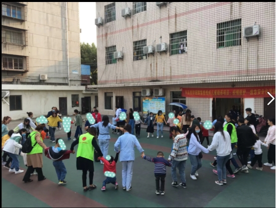 随后,大家以4—11人的分组陪同不同班级的孩子进行学习与玩耍,志愿者们耐心守护,寸步不离,搭积木、拼图形、擦鼻涕、举高高、牵手手等各种方式与小朋友拉近距离。我们也将带来的水果和饼干分给了每位小朋友。在进行教室活动后,我们与全体小朋友在操场进行围圈跑活动,围的圈时大时小,目的就是为了锻炼小朋友的肢体协调能力以及指令意识。在经过2个小时的陪伴后,小朋友们到了回家的时候,志愿者们也安静的进行了活动留影。