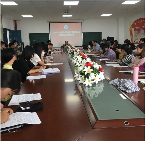 于2020年9月17日在文科楼A区1104室组织召开了2017级学生考研交流座谈会暨教育实习安全教育大会。学院院长姜学勤、党委书记吴智勇、王金洲教授、副书记马小佼、副院长张莉、辅导员张云雾、李敏以及负责学生实习工作的汤波兰老师共同参会,会议由马小佼副书记主持。