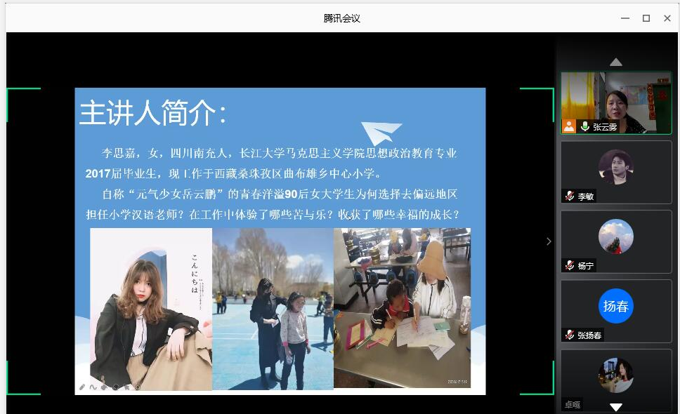 为深入学习、宣传、贯彻习近平总书记回信精神,鼓励广大青年学生不惧风雨、勇挑重担,让青春在党和人民最需要的地方绽放绚丽之花。7月19日,学院邀请了现工作于西藏桑珠孜区曲布雄乡中心小学和中共洪湖市委组织部的2名2017届校友李思嘉、王盛华通过腾讯会议为全院学生做了立志服务基层成长故事分享会。学院学院党委副书记马小佼、全体辅导员参会。