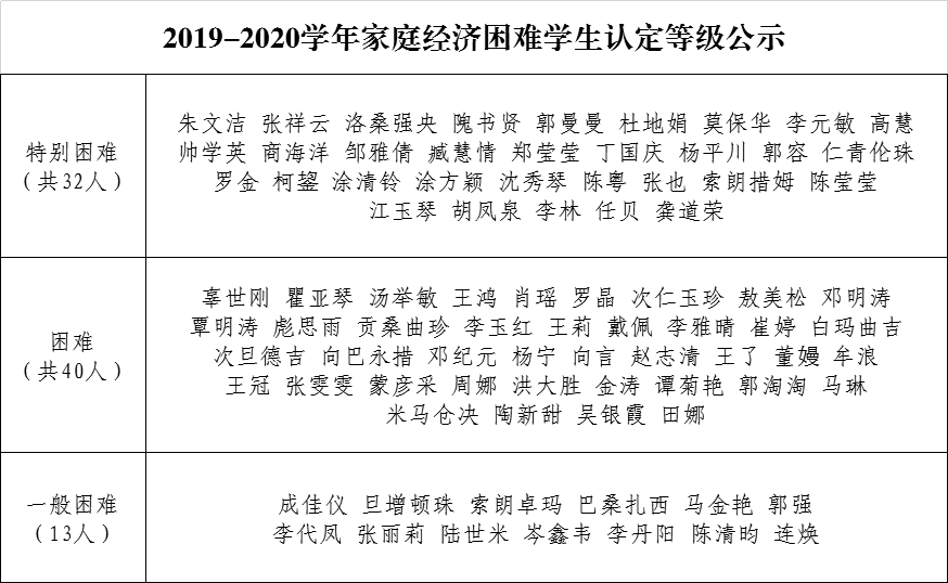 按照相关文件规定及要求,av解说 开展了2019-2020学年家庭经济困难学生认定工作。通过前期资助政策宣讲,学生申请、提交材料,班级小组组建、公示,小组评议、班级公示等步骤,现将av解说 2019-2020学年家庭经济困难学生等级公示如下: