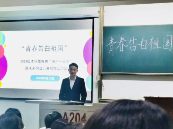在13教A204教室开展“青春告白祖国”——2019级本科生畅想“两个一百年”致未来的自己书信撰写活动。辅导员李敏老师、优秀学长学姐代表和2019级全体本科生参加活动。