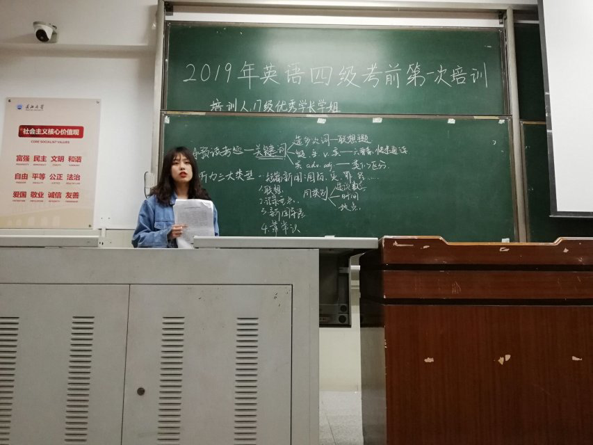 于4月10日晚7:00,在主教207室开展了第一次英语四级考前培训。本次培训的主讲人是17级四级成绩优秀的毛雨晴和覃美南两位同学,培训的主要内容为作文和听力专题。
