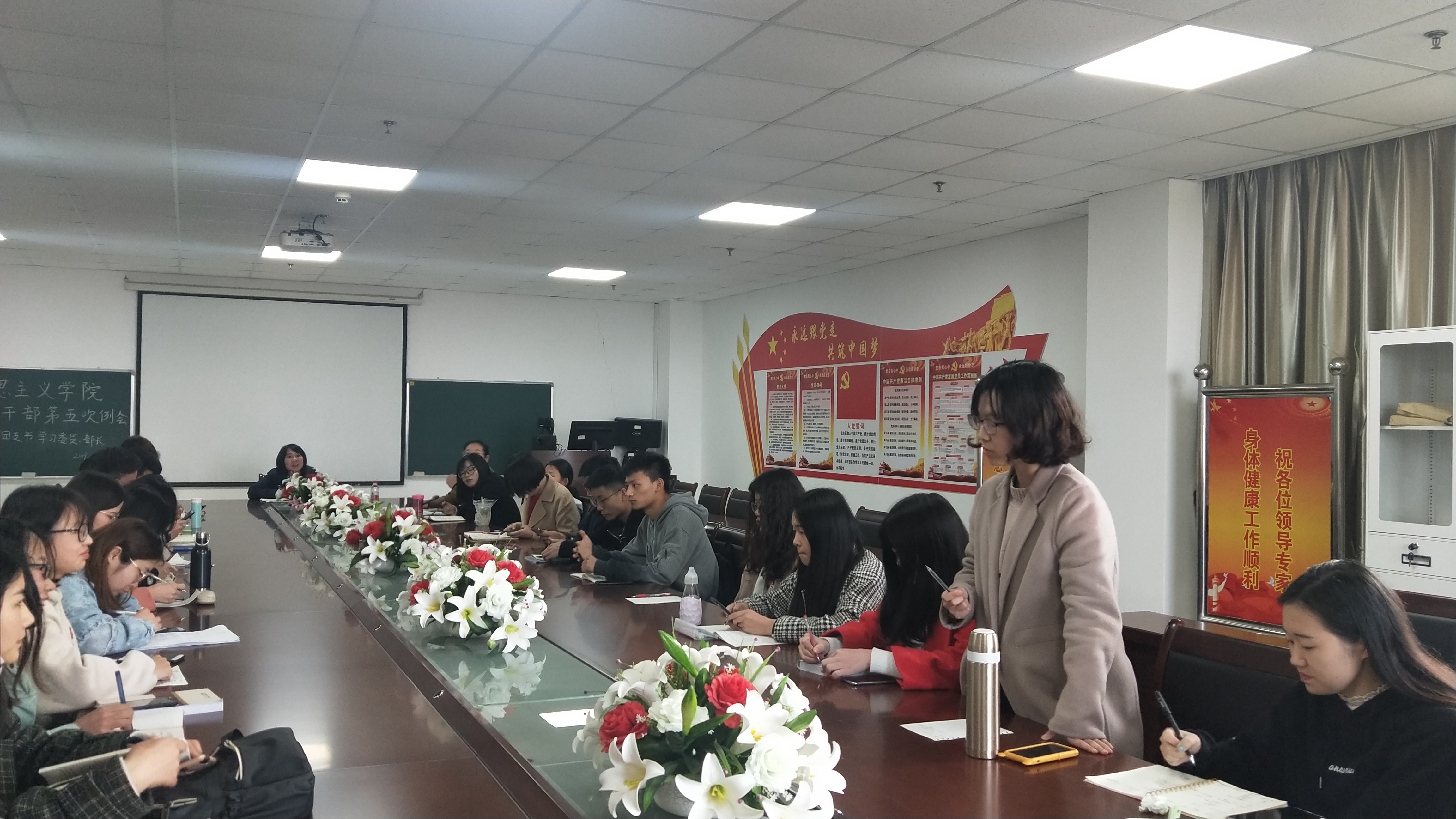 本次会议包括三个环节,第一个环节是各部门代表汇报本学期工作,开学一个月以来学生会的工作主要围绕近期的“长江春潮艺术体育节一系列活动来进行。会议的第二个环节,张老师就开学一个月以来的工作做总结并指出问题。首先近期存在的主要问题有:考勤记录不准确、普通话报名率不高、四级通过率较低、早晚自习到勤人数太少等等,张老师强调大家要认真对待早晚自习,重视四六级考试。同时还存在每周四寝室卫生大检查时,部分寝室对评比结果不满意,她提出要改进学生会宿建部的工作方式,并会在近期召开寝室长会议,详细讨论相关事宜。另外一个问题就是青年大学习的完成率不高,她提出了很多建议比如集体观看,或者完成后在群里发言等来提高大家对青年大学习的积极性。接着,张老师进行了工作部署,主要有:学风建设大会的精神传达,出台学院学风建设方案,着重提到以家校合作的方式将旷课挂科记录通报给家长以促进学风建设。会议最后一个环节,各学生干部代表就近期工作状况做总结反思并进行自我批评。到会学生干部都认识到了各自工作中存在的问题,并表示了自己改进提升工作质量的决心。