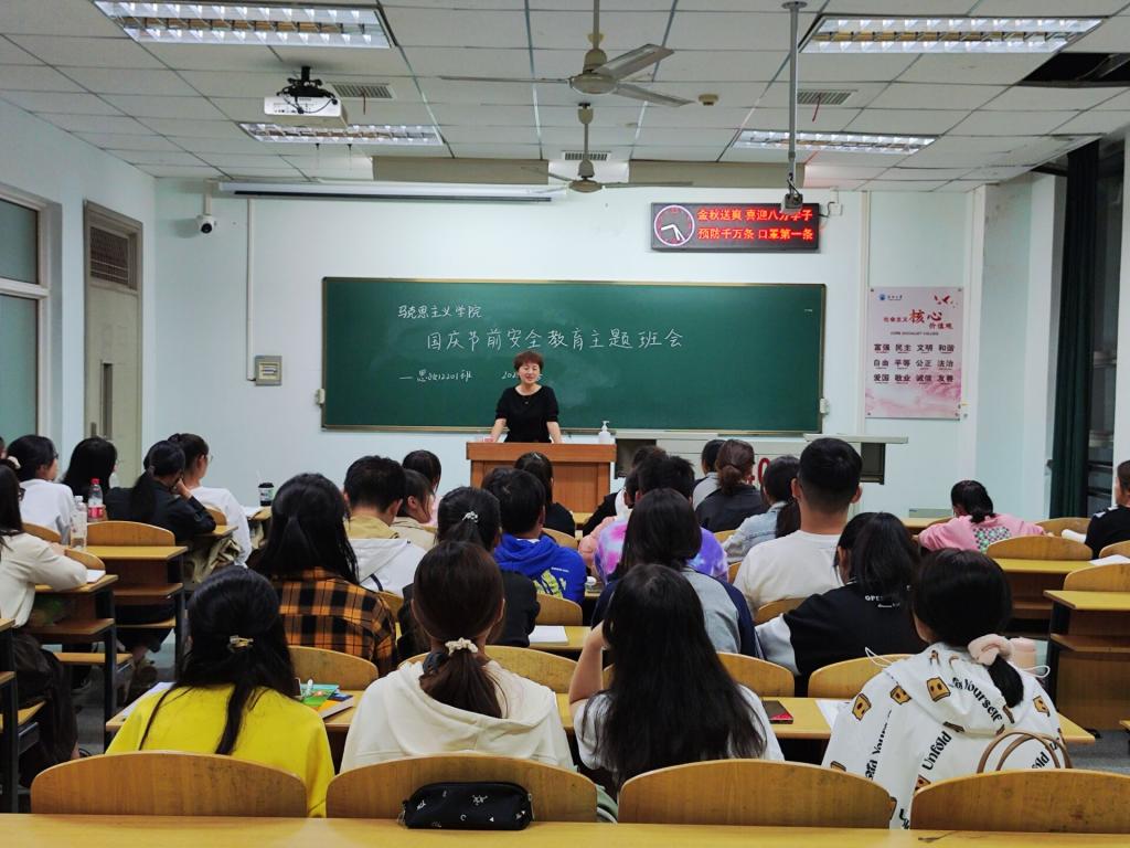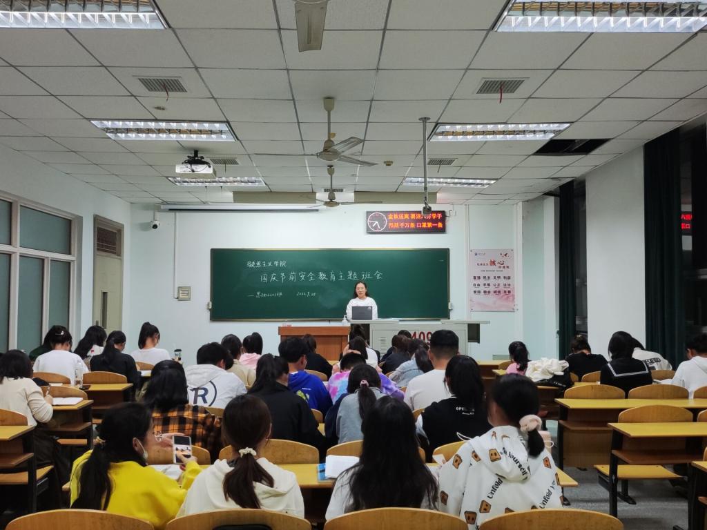 思政12201班于13教B409召开国庆节前安全教育主题班会,班主任马小佼,班主任助理袁田及思政12201班32名同学参会,4名同学因疫情原因无法到场参加。