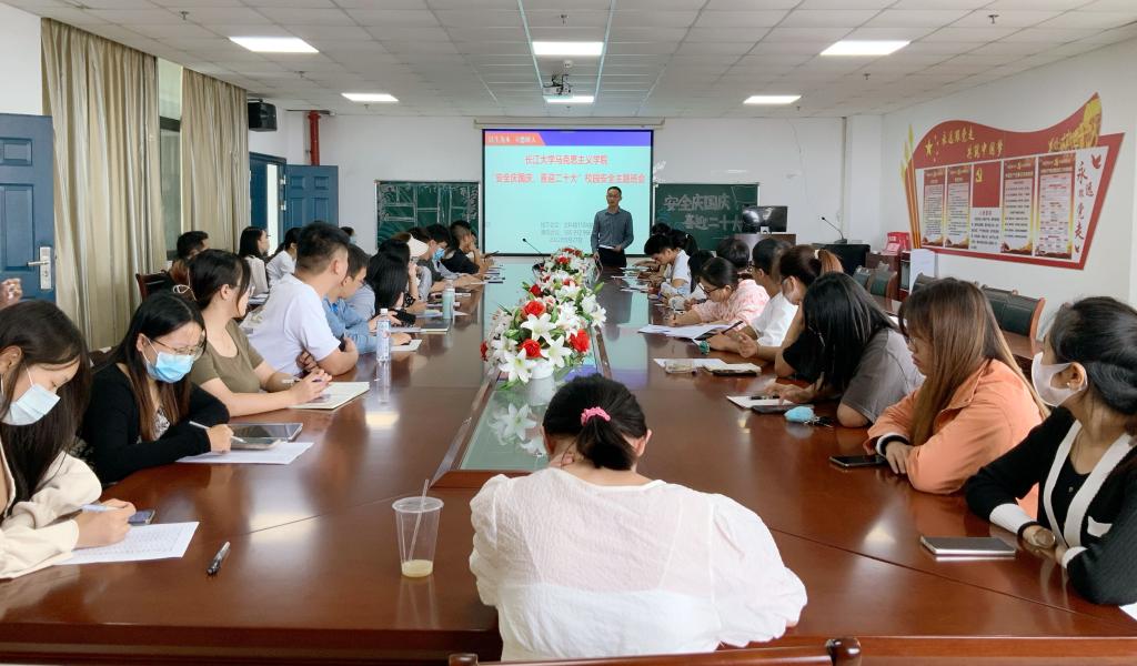 在文科楼1104室和腾讯会议同步召开“安全庆国庆、喜迎二十大”安全教育主题班会。院党委副书记马小佼、辅导员张云雾、李敏以及全院本、研学生参会。