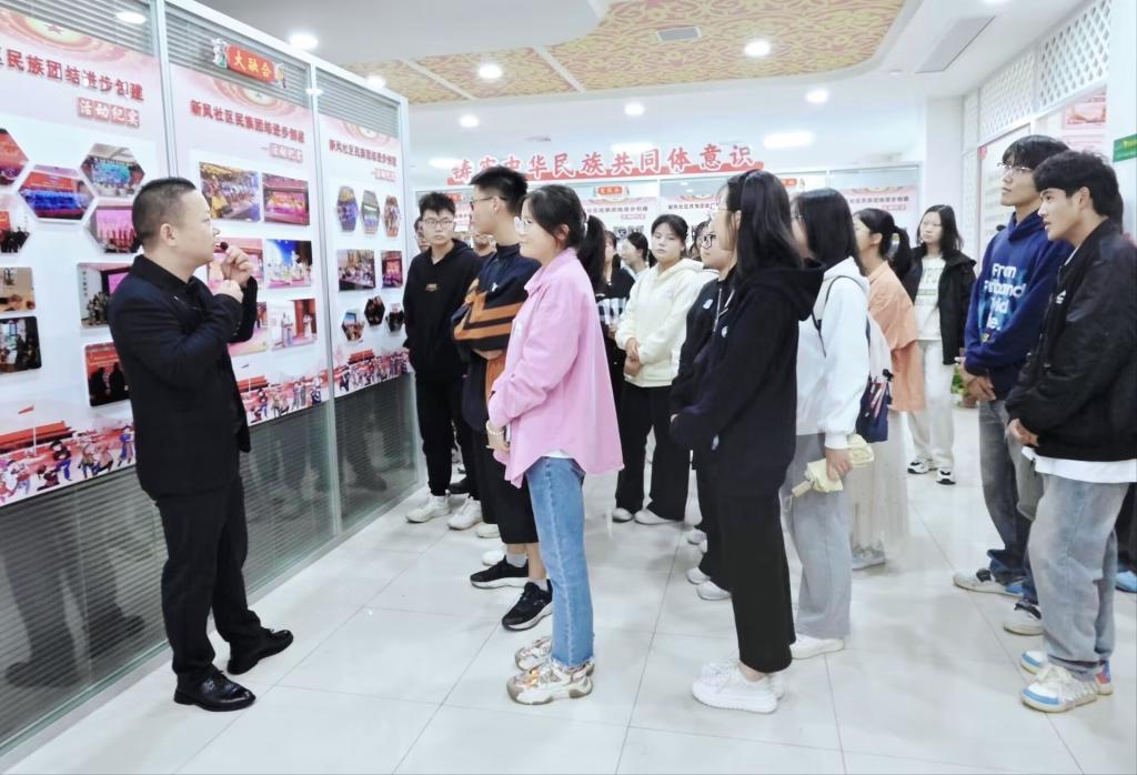 在荆州城南高新园新风社区“铸牢中华民族共同体意识”体验厅,全国民族团结进步模范个人,新风社区居委会委员、治保主任李孝明从建阵地、重服务、强学习、促团结、大融合等五个方面,为师生全面系统介绍了该社区在促进各民族交往交流交融、铸牢中华民族共同体意识方面的做法和成效。大家还通过观看图片、视频等方式,进一步了解各民族密切交往、守望相助、团结奋斗的生动历程。