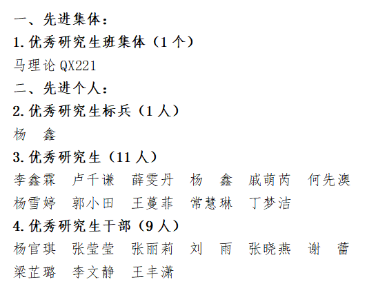 根据《关于评选2022-2023学年研究生先进集体、先进个人的通知》的文件精神,由学生本人和集体自愿申报,班级民主评议,学院评审小组集中评审,拟推选出1个优秀班集体和杨鑫等20位先进个人。具体名单公示如下: