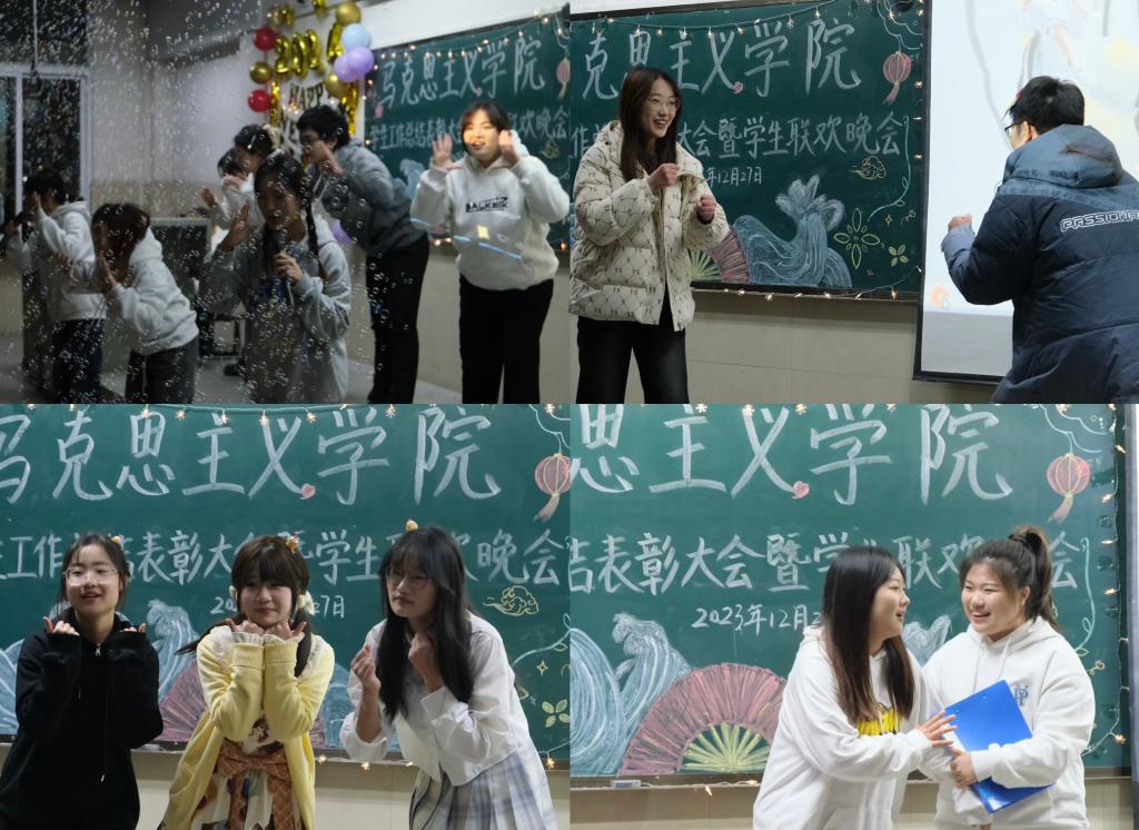 在12教204举行学生工作总结表彰大会暨元旦联欢会,院党委副书记汤慧珍、学工办主任张云雾、研究生会主席团成员何先澳及av解说