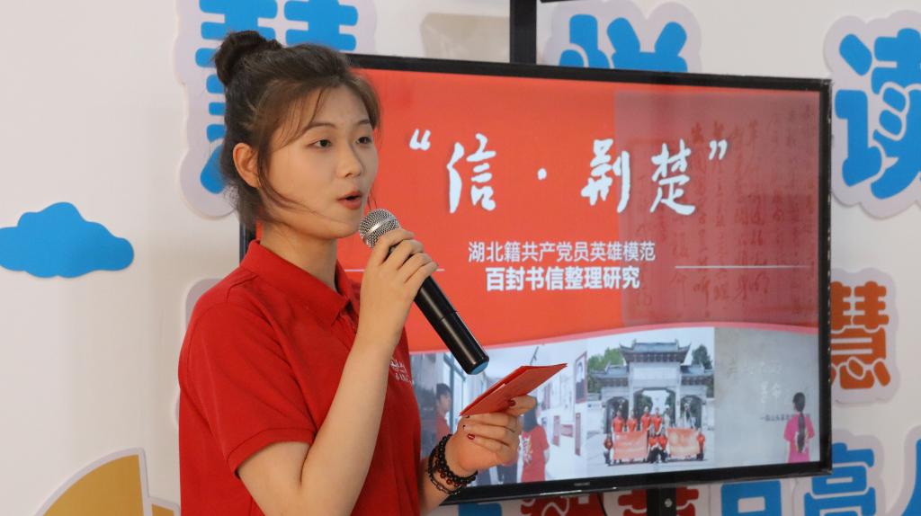 “寻笺叙史觅初心,做新时代的回信人!”“信·荆楚”团队成员崔安欣展示了团队四年的成长发展历程,着重介绍团队今年暑期前往北京、山东、湖北、广东的寻访调研经历。