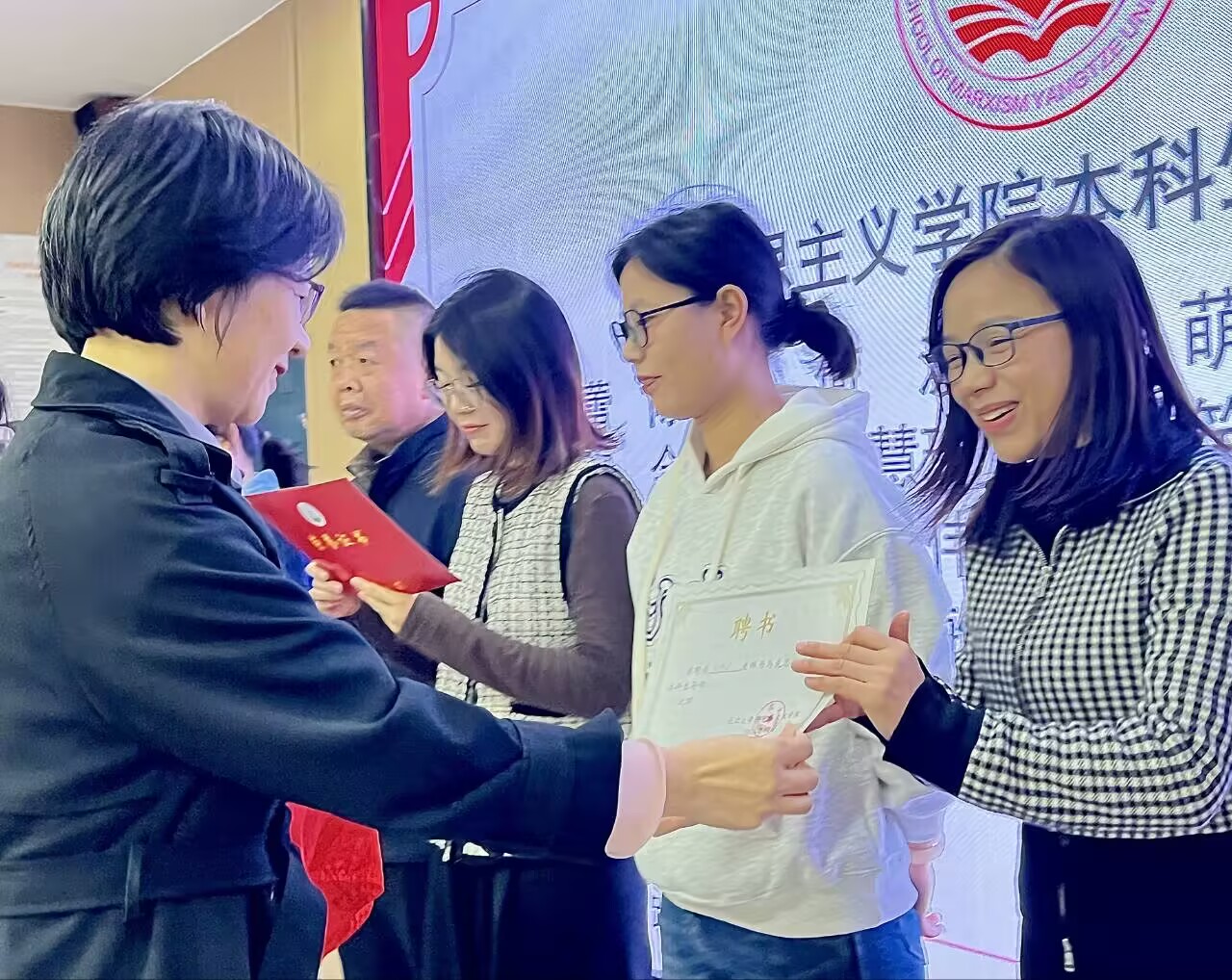 聘任仪式环节,学院党委书记刘小燕为导师代表颁发聘书,传递学院的信赖和对学生的期待。2021级本科生赖丽婷作高年级学生代表发言,她回顾了自己的成长历程,感慨道:“感谢我的引路人张云老师,感谢学院对我们本科生的关心,让我的大学生活更加有意义。”
