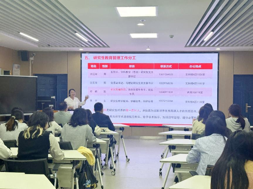 在文科楼1008会议室召开2025级研究生入学教育会。学院党委副书记竺正海、学工办主任张云雾、研究生辅导员邓鹏及全体2025级研究生参加会议。