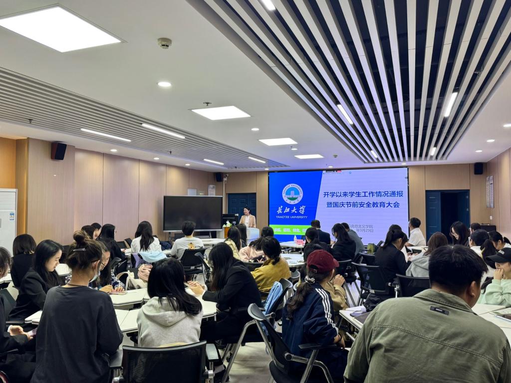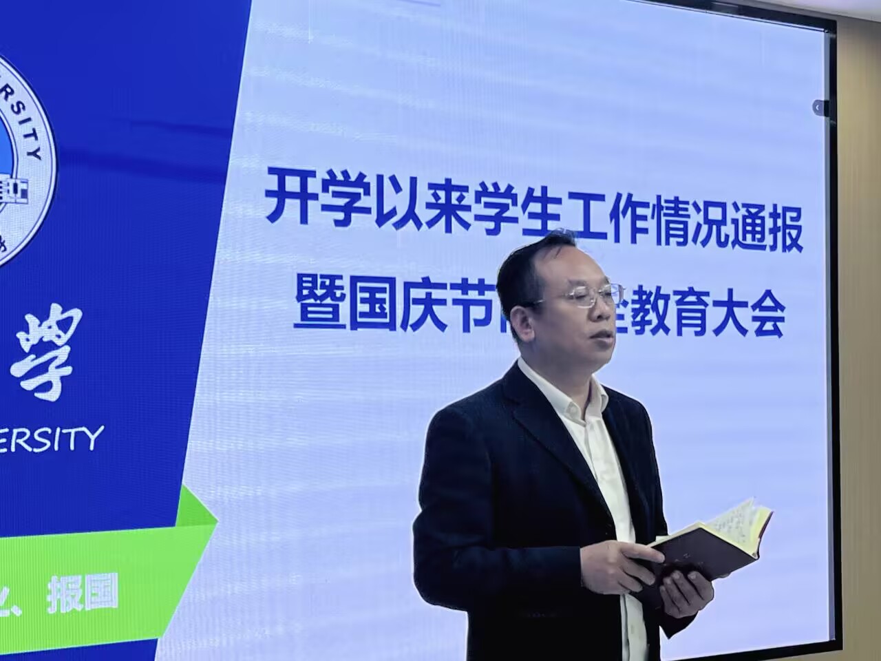 普通本科生奖助学金管理办法》进行了解读,部署了2024-2025学年学生工作先进集体和先进个人评选工作。随后,邓鹏老师重点就研究生国庆假期安全稳定工作进行了强调,要求全体学生干部切实履行提醒与监督职责,全力保障广大同学平安度过假期。