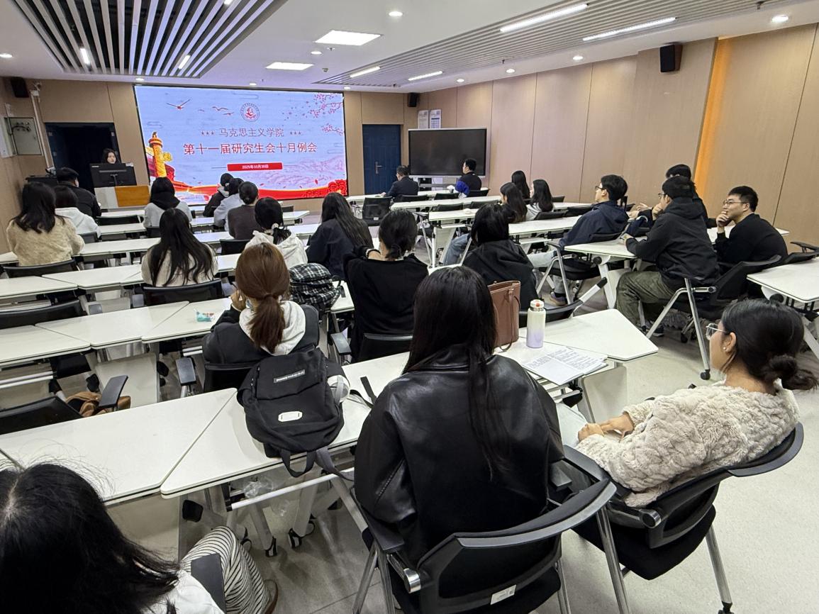 于10月30日在文科大楼1008室召开了研究生会10月总结例会。学院党委副书记竺正海、辅导员邓鹏以及第十一届研究生会全体成员参加会议。本次会议由学科思政QZ251班学生黄琳雯主持。