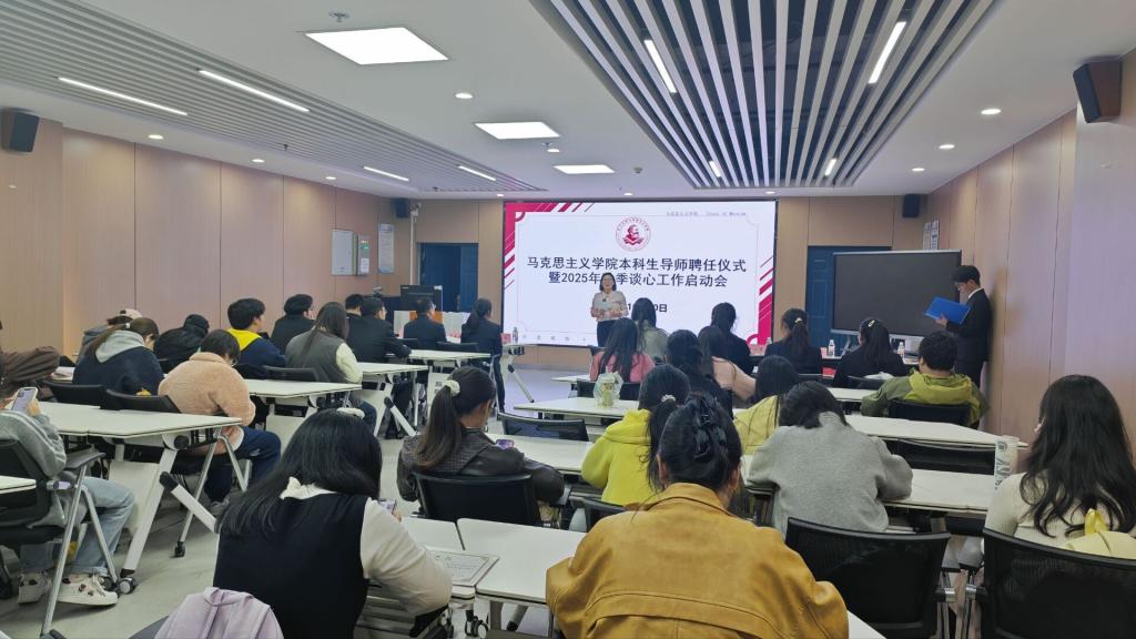 于10月30日下午在文科1008室举行2025年秋季学期本科生导师聘任仪式暨谈心工作启动会。学院党委副书记竺正海、副院长张莉,学工办主任张云雾、辅导员邓鹏,以及部分受聘的本科生导师、全体本科新生参会。