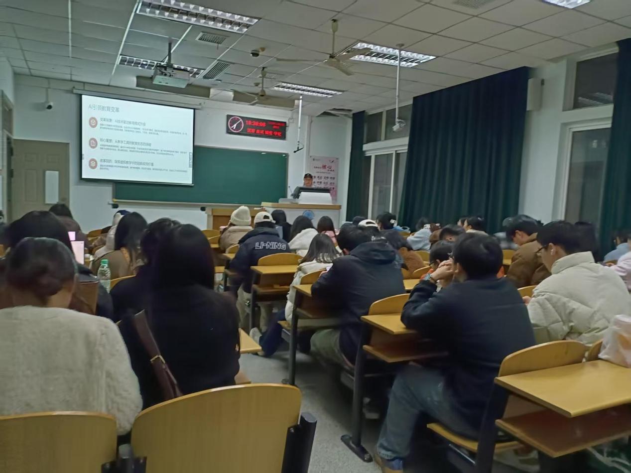 计算机科学与技术学院刘鹏老师主讲《AI在虚拟教学中的应用探索》。刘老师深入解析了生成式人工智能如何重塑教育生态,重点介绍了智能助教、个性化学习路径、虚拟实验等应用场景,并结合天津大学“数字老师”、猿辅导“海豚AI学”及劳动教育AI教师“劳博士”等案例,生动展示了AI在提升教学效率、实现精准育人方面的实践成果。