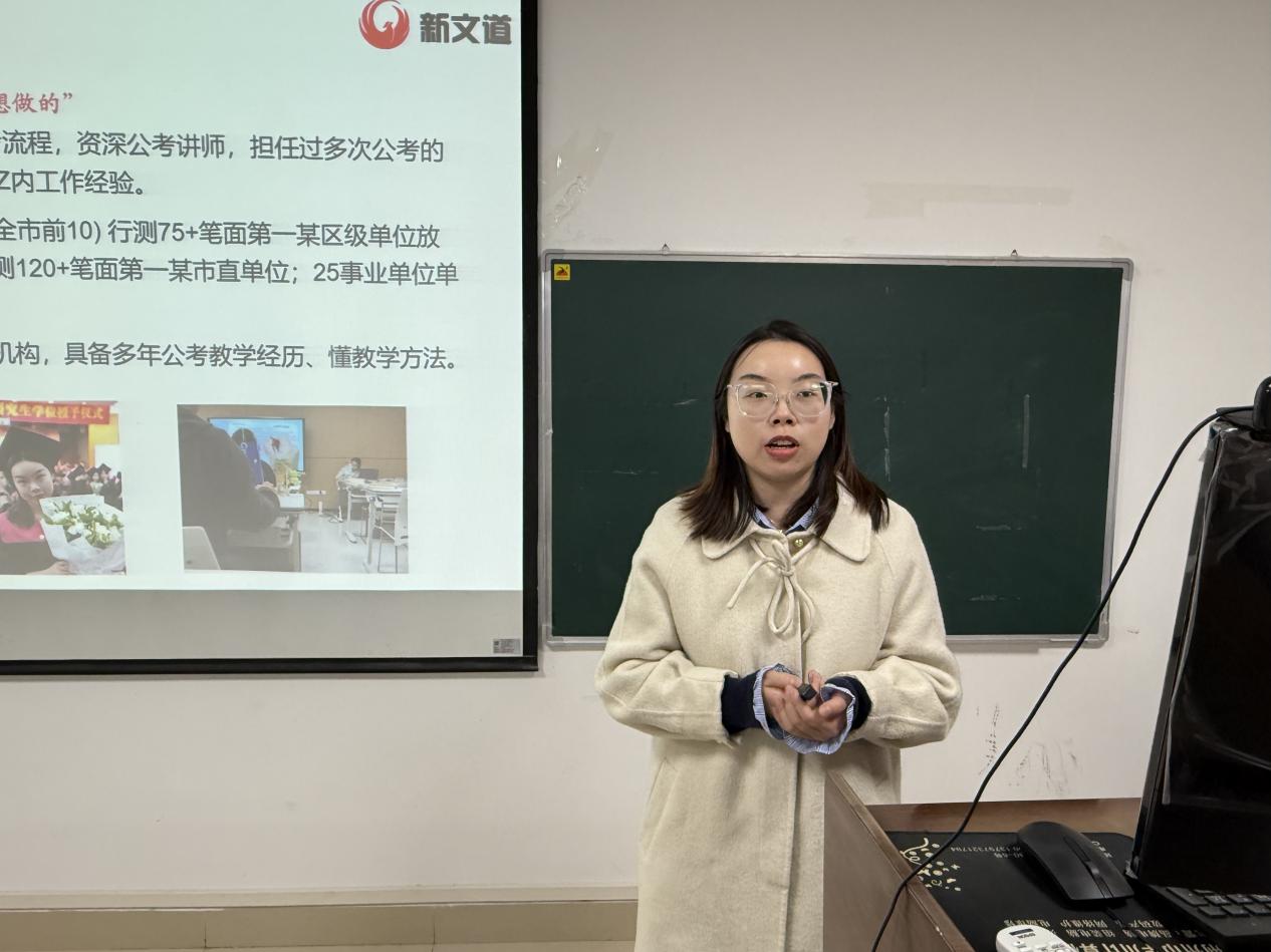 于文科楼1104教室隆重举办人才引进专项政策解读暨复习规划讲座。本次讲座特邀荆州新文道教育资深讲师陈雅倩老师主讲,学院辅导员邓鹏老师及50余名研究生共同参与。