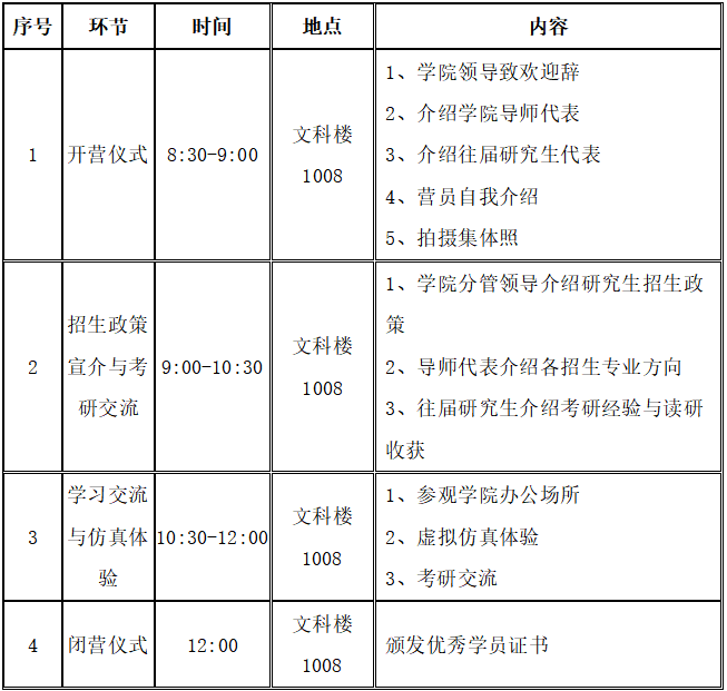 拟于2024年7月5日举办2025年硕士研究生招生夏令营活动,活动举办期间,将向营员全面介绍各学院基本情况、学科发展近况、研究生培养情况,举办学术讲座、现场参观、师生交流、考研交流等活动。
