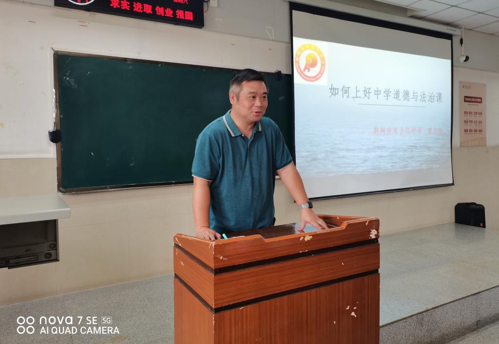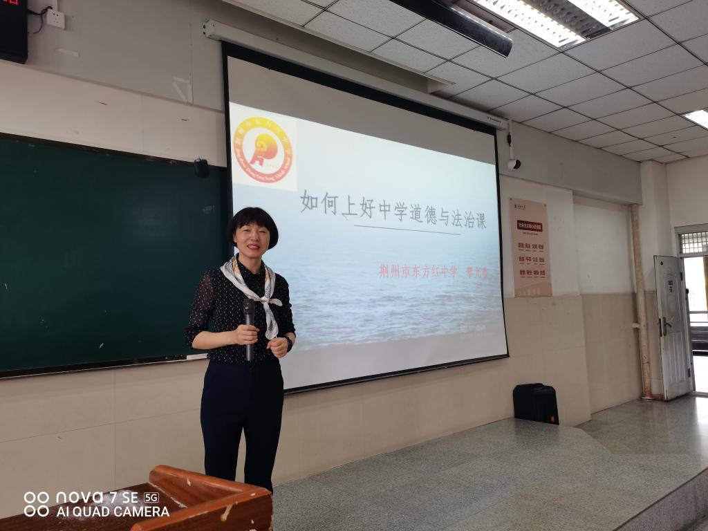 黎老师从中学生的特点出发,探讨了中学道德与法治的特点和如何上好中学道德与法治课。黎老师分享了自己在教学道路上的成长经历,用丰富的案例提出上好中学思政课要深入研究教材,要善于将教材语言变成教学语言;要深入分析自己的教学对象,真正爱自己的学生;要积极参加教学比赛,通过高水平比赛快速提升自己的教学水平。